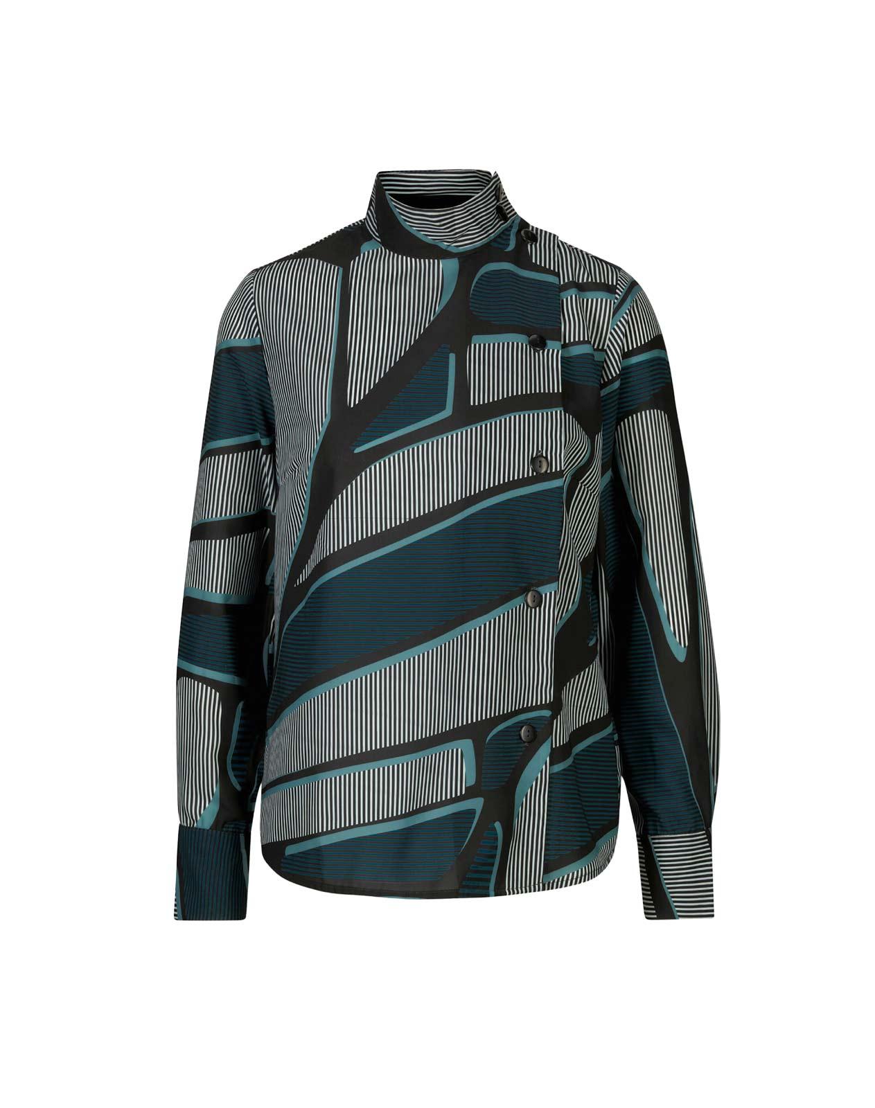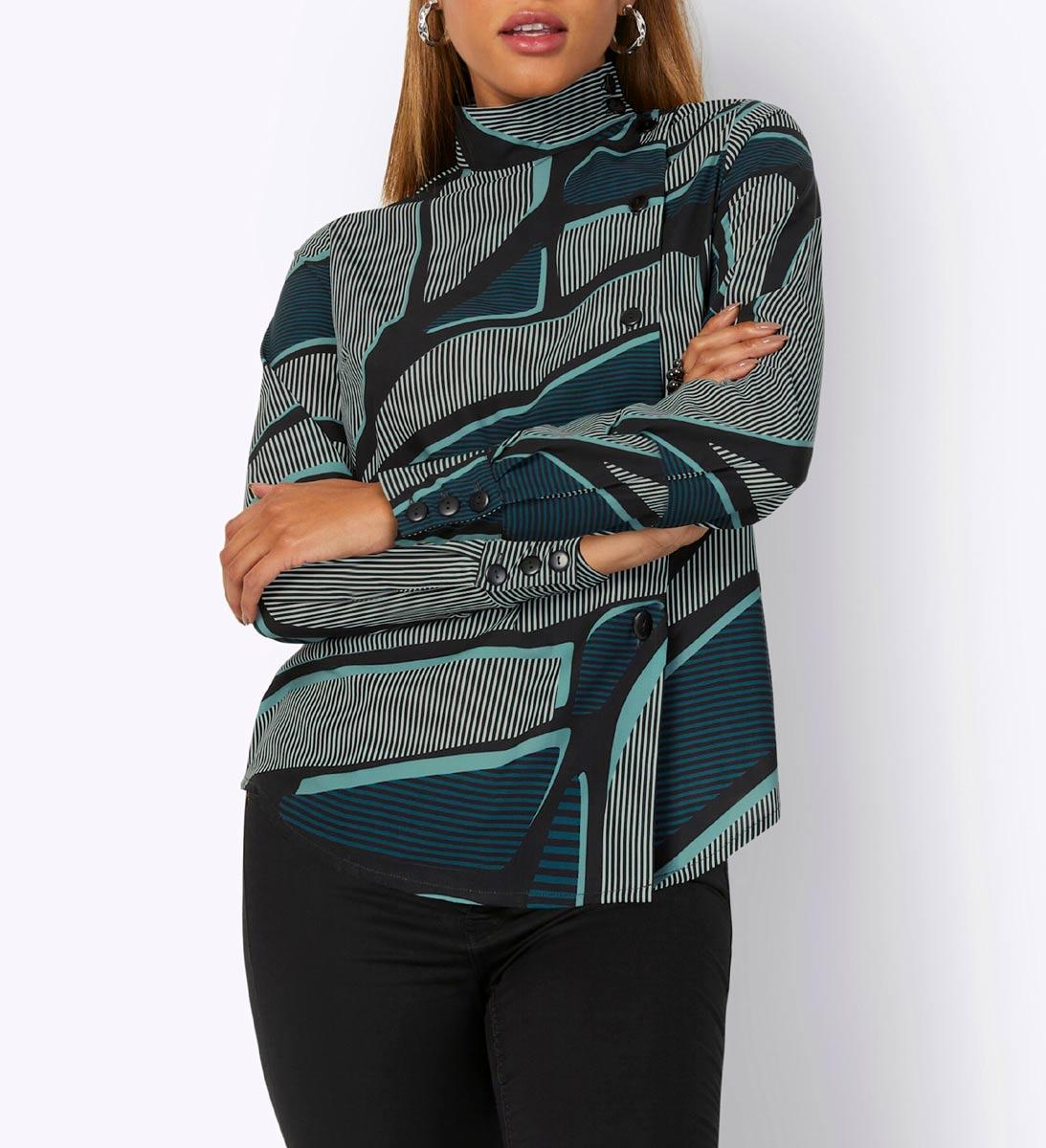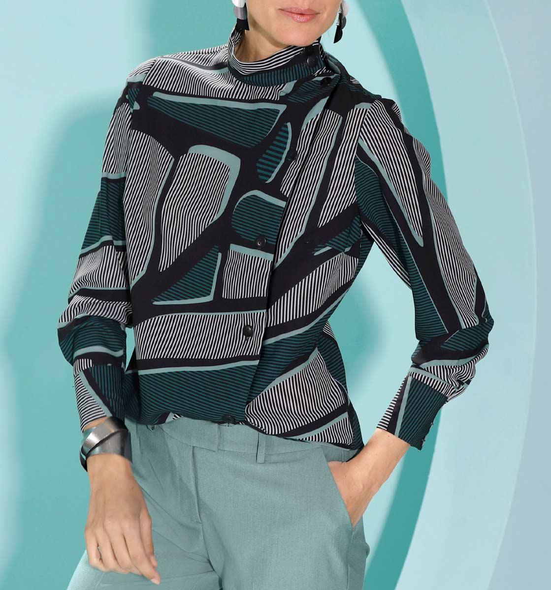 Fesseln Sie die Blicke mit dieser Bluse in modischer Trendfarbe. Extravagant der Stehkragen mit breiter Blende am überlappendem ...